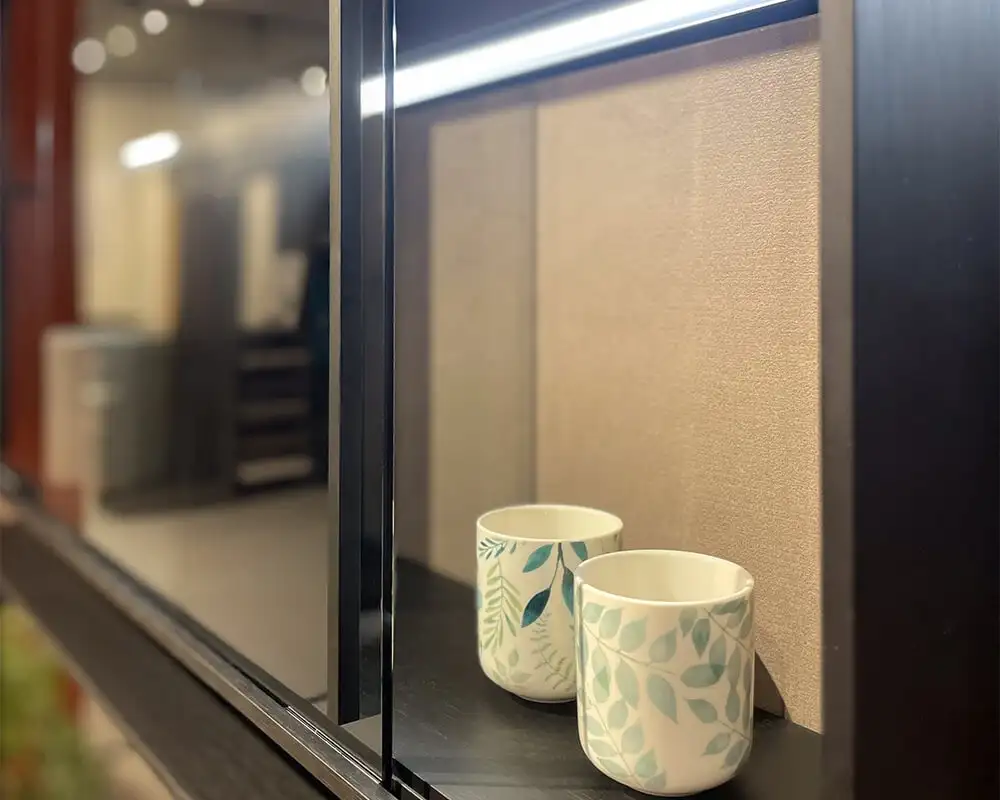 Available in brushed titanium and brushed black finishes, the module is offered at a single height of 400 mm and in three widths, allowing for different design configurations. Color-matched handles and integrated seals ensure smooth and quiet sliding, maintaining a coherent and refined design.