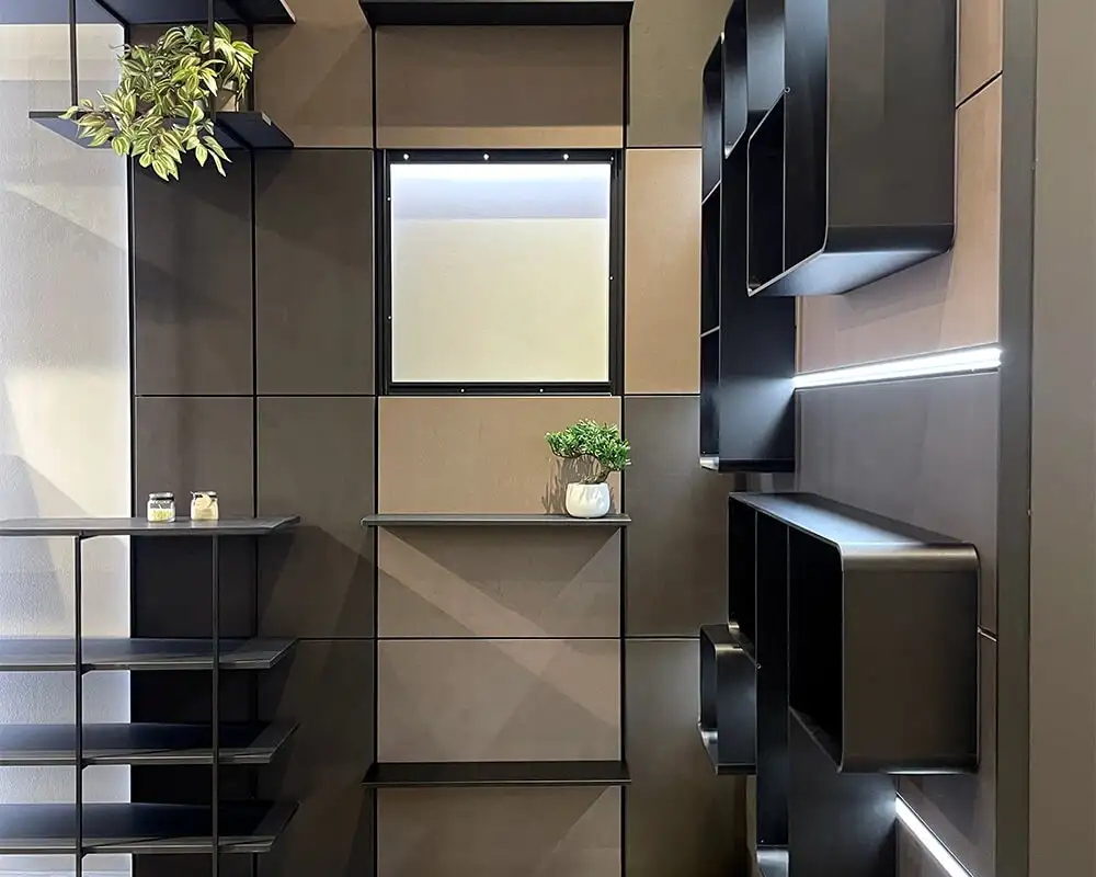 The Vertical 10 boiserie by Ossicolor is a design solution conceived to harmoniously connect the kitchen and living areas. Thanks to its modular structure, Vertical 10 provides a solid and flexible support system for televisions, wall cabinets, base units and shelves, blending technical performance with contemporary design.